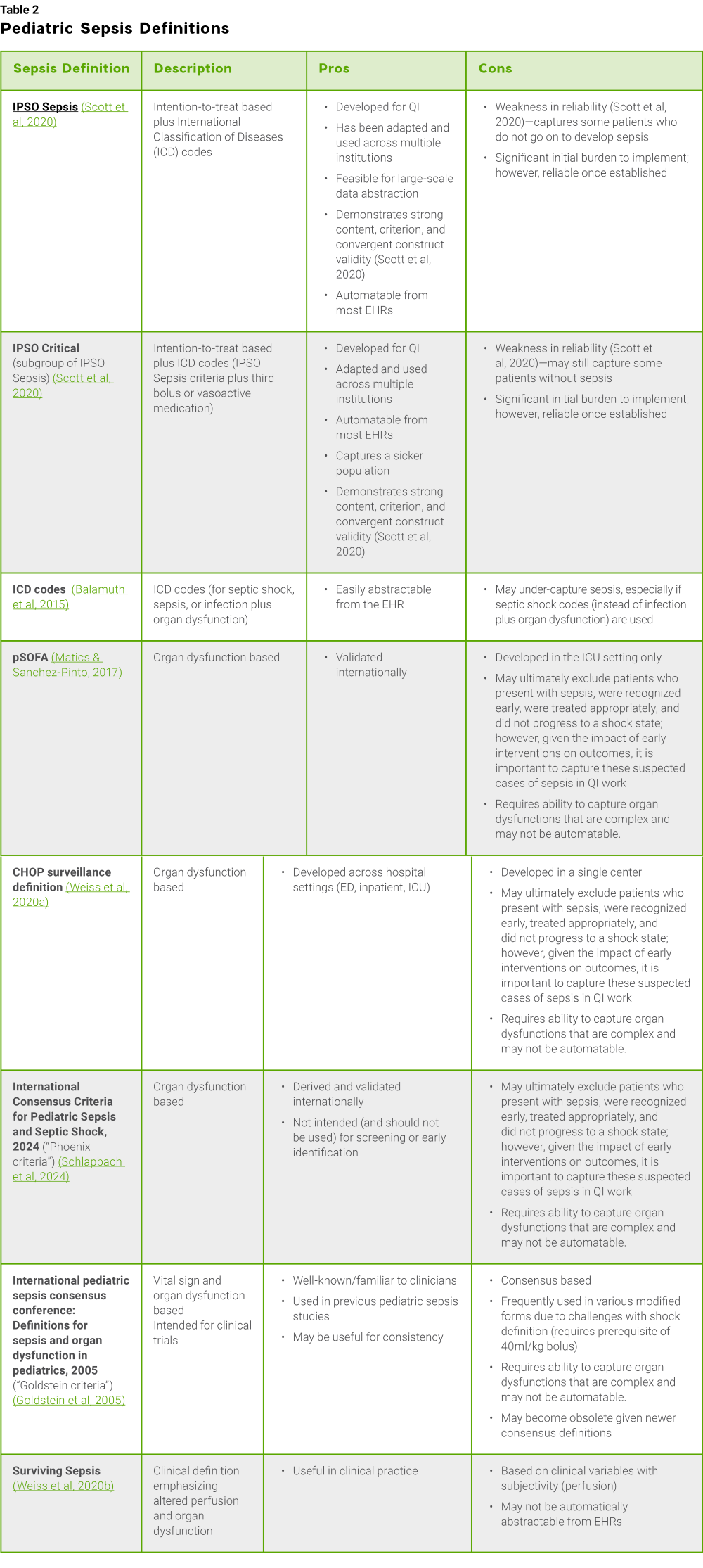 The table below includes multiple proposed sepsis definitions along with their pros and cons for quality improvement work. This list is not exhaustive and continues to evolve. New pediatric sepsis definitions are expected in the next few years.